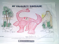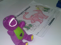 He drew his fave Brachiosaurus, he won and got this cute singing Barney!